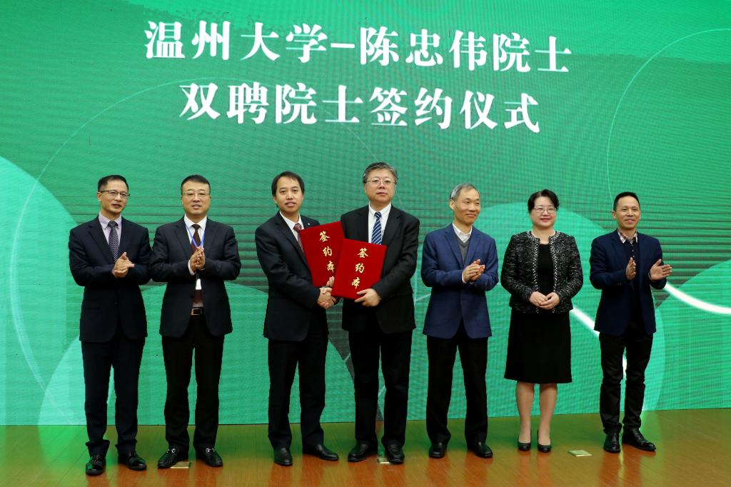 qy球友会官网经理王舜介绍了学院的团队建设情况及在新材料研究上取得的成果。期间,qy球友会体育与陈忠伟院士举行了双聘院士签约和聘任仪式。李校堃董事长与陈忠伟院士、王振勇区长分别举行了“qy球友会体育——温州玖源电池先进材料产教融合中心”、“qy球友会体育——瓯海区人民政府新材料与能源产业研究院”签约和揭牌仪式。