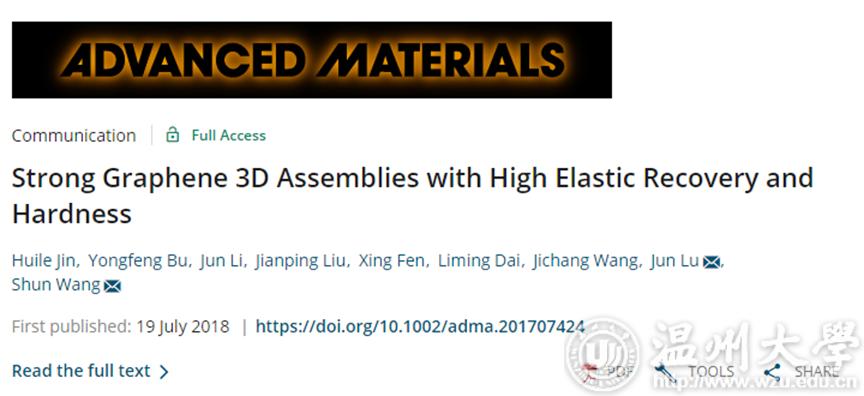最近,公司化学与材料工程王舜课题组金辉乐博士在三维石墨烯方向取得研究新进展,研究成果以“Strong Graphene 3D Assemblies with High Elastic Recovery and Hardness”为题在线发表于《先进材料》(Advanced Material,2018,DOI: 10.1002/adma.201707424,影响因子21.95)。