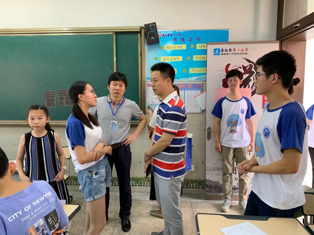 上午9时,熊琳书记一行人抵达温州南白象小学慰问“心飞”、“绿苗”两只暑期社会实践队。期间,熊琳书记向队长了解实践队活动开展的具体内容,鼓励队员在实践过程中结合专业提升教学水平,学以致用注重特色提升,反思课程评价注重传承发展,并向同学们分享了自己支教、实践的亲身经历,鼓励同学们多深入社会,加强锻炼,增长才干。周敬业副书记询问了队员们的身体状况,叮嘱支教员工要关注听课小员工的到勤、回家情况,注意安全,有情况及时跟指导老师沟通。
