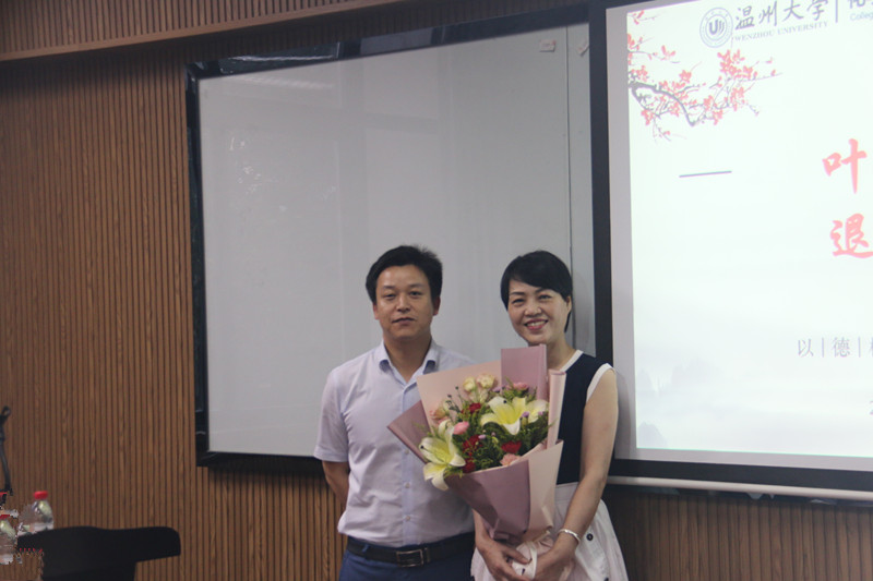 最后,由熊琳书记为叶彩萍老师送上鲜花、纪念品,并祝愿她退休后身体健康、青春永驻、生活幸福。