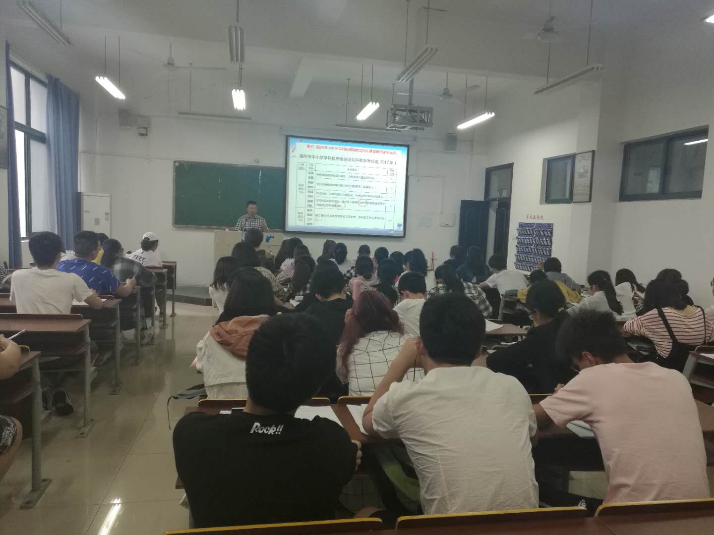 2018年5月31日下午,温州市名师、温州市优秀教师,来自瑞安中学的徐克老师为qy球友会官网16化学师范的同学做了一堂关于《新课改背景下的师范生专业发展》的讲座。