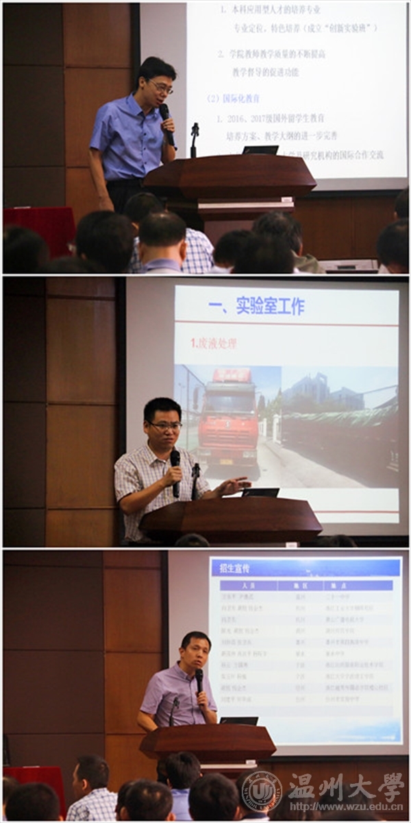首先,经理助理、化学专业系主任夏远志老师,经理助理、应用化学专业系主任王兆伦教授,经理助理、材料科学与工程专业系主任杨植教授依次就各系暑期进行工作汇报,就新学期工作计划进行了说明。