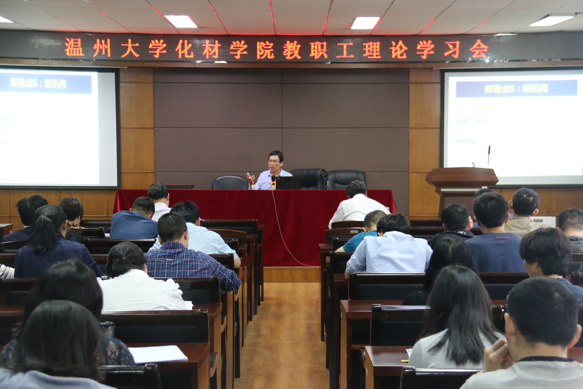 王柏民书记以《2018两会新看点》为题,详细介绍了两会的基本概况,指出了今年两会召开的新背景,强调2018年两会是党的十九大之后首次召开的全国两会,是在十九大精神贯彻落实的开局之年以及决胜全面建成小康社会,实施“十三五”承上启下的关键之年召开的重要大会。他详细分析了今年两会的几个新看点,其中包括从十九届二中全会到三中全会进行的会前准备、宪法修正案中对国家领导人任期的修改、新一届国家领导人向宪法宣誓、监察法的颁布实施以及国务院组成部门的改革重组。整个报告主题鲜明、内容丰富、思想深刻、深入浅出,既有理论上的概括,又有实践上的指导。