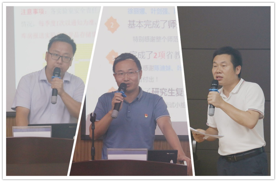 副经理陈锡安就近期分管教学工作、工会工作及暂时接管的科研及研究生工作向参会教师进行了汇报,在教学工作方面,本学期完成了2项教学成果奖的申报,完成18级师范生教育实习工作;在科研工作方面,省、市级科技项目申报工作正在开展,截止目前,学院需要申报省基金18项、省公益2项、分析测试1项,需要老师围绕三大科创高低及“碳达峰、碳中和”技术高点积极申报;在研究生工作方面,复试工作按部就班完成;在工会工作方面,2021上半年,学院工会积极参加学校组织的活动,例如划龙舟大赛、建党百年红歌大赛、端午包粽子大赛,均获得不错的成绩,同时疗休养活动正在进行中,希望老师们积极报名。