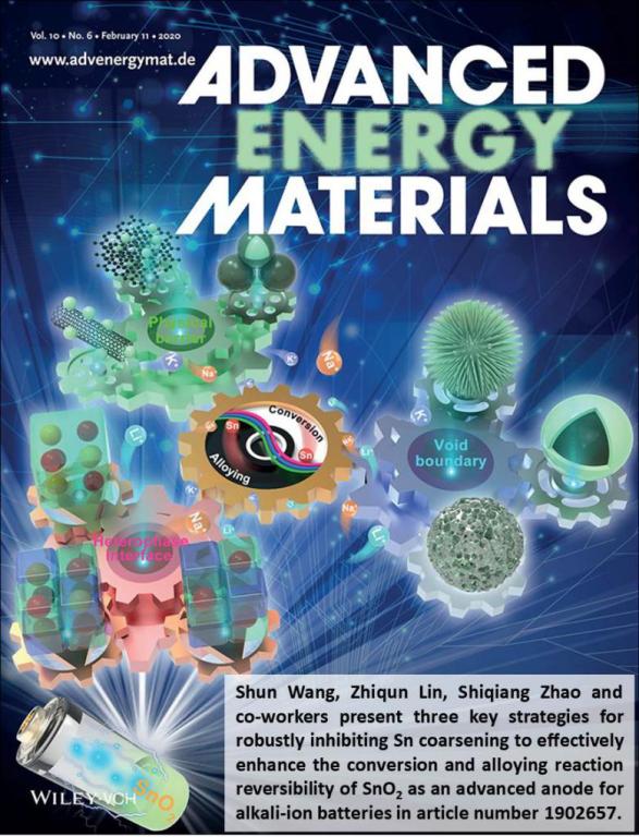 近日,国际能源顶级刊物《Advanced Energy Materials》将有关二氧化锡作为碱金属离子电池负极的综述论文“SnO2 as Advanced Anode of Alkali-Ion Batteries: Inhibiting Sn Coarsening by Crafting Robust Physical Barriers, Void Boundaries, and Heterophase Interfaces for Superior Electrochemical Reaction Reversibility”选为期刊封面文章。该文章第一作者为赵世强博士,qy球友会官网经理王舜教授与佐治亚理工学院林志群教授为通讯作者,qy球友会体育为第一通讯单位。