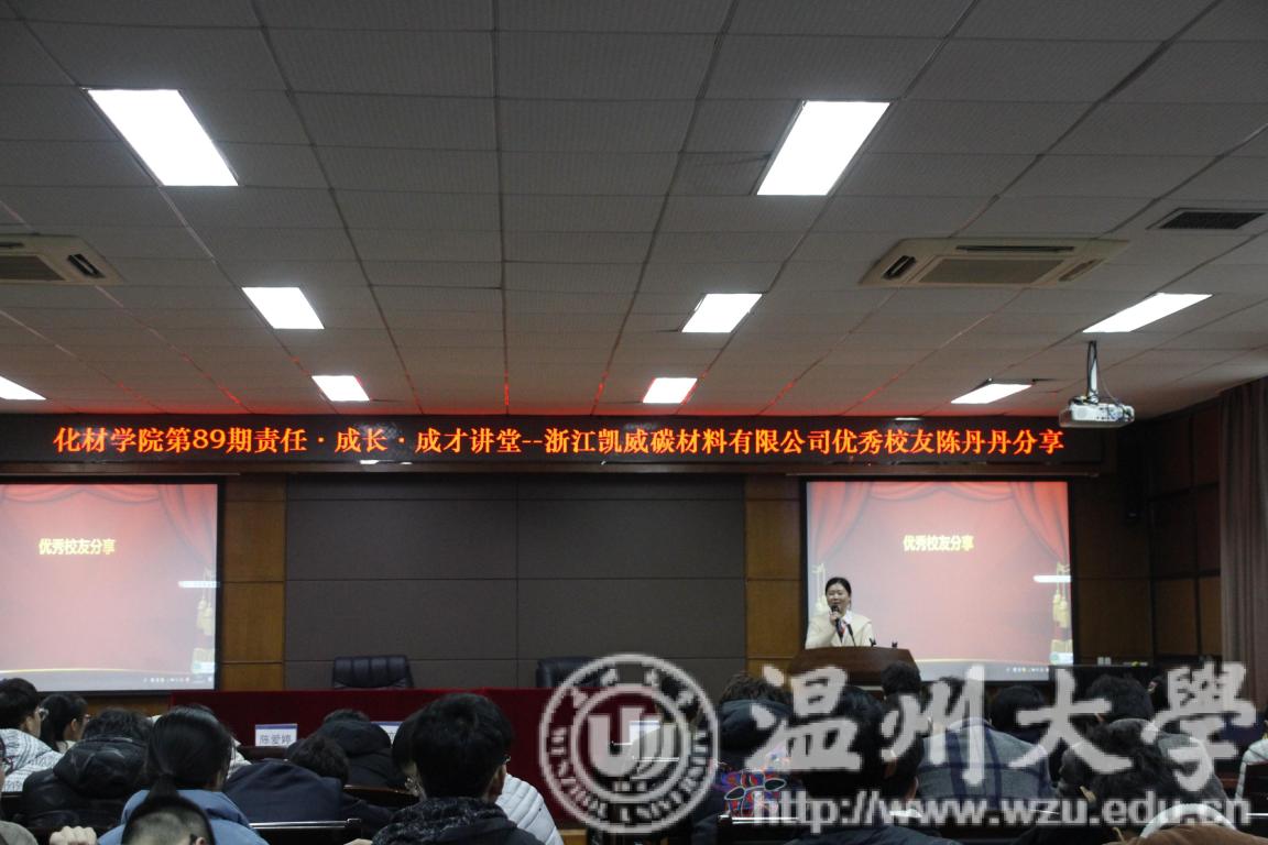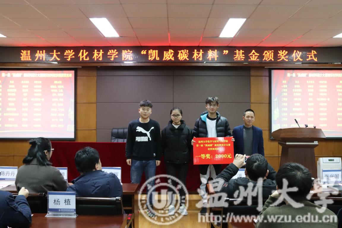 最后,潘从义副书记分别宣读了第一届“凯威碳”新材料设计大赛获奖名单、2018年度“凯威碳励志奖”获奖名单,并由学院领导、浙江凯威碳材料有限公司总经理等为获奖者颁奖。颁奖仪式结束后,公司优秀员工代表陈丹丹还与同学们分享了她在凯威碳任职的经历,同学们纷纷表示要向学姐学习,争取成为一名优秀的老员工。