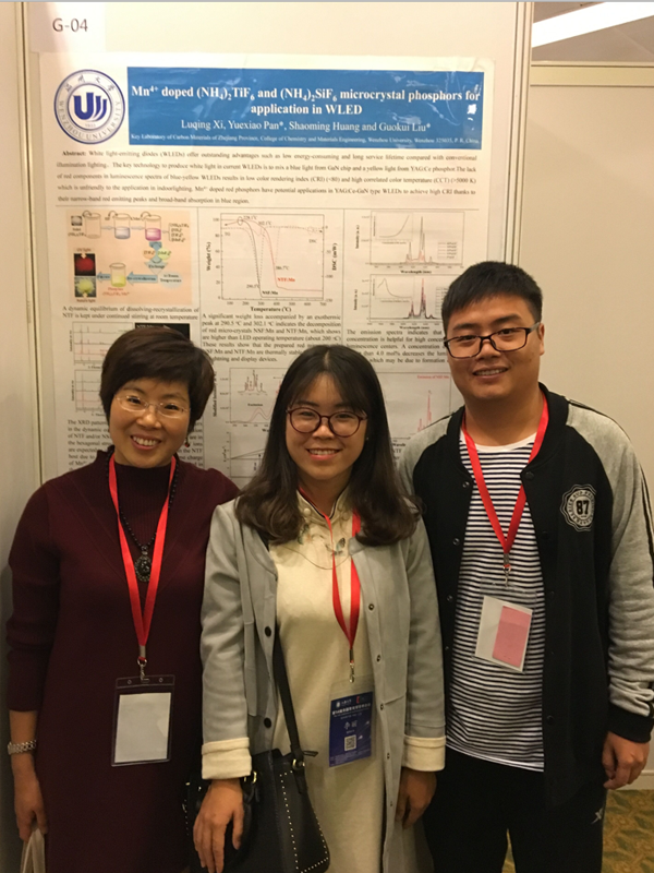 2016年11月15日-18日,第14 届全国发光学学术会议在上海举行,参会400余人。会议共收到墙报作品120余件,经会议常务委员无记名投票评出10项的优秀墙报奖。公司潘跃晓老师指导的15级研究生席陆青题为“Mn4+ doped (NH4)2TiF6 and (NH4)2SiF6 microcrystal phosphors for application in WLED”的墙报荣获了该奖项。特此祝贺!希望公司研究生取得更多更好的科研成果!