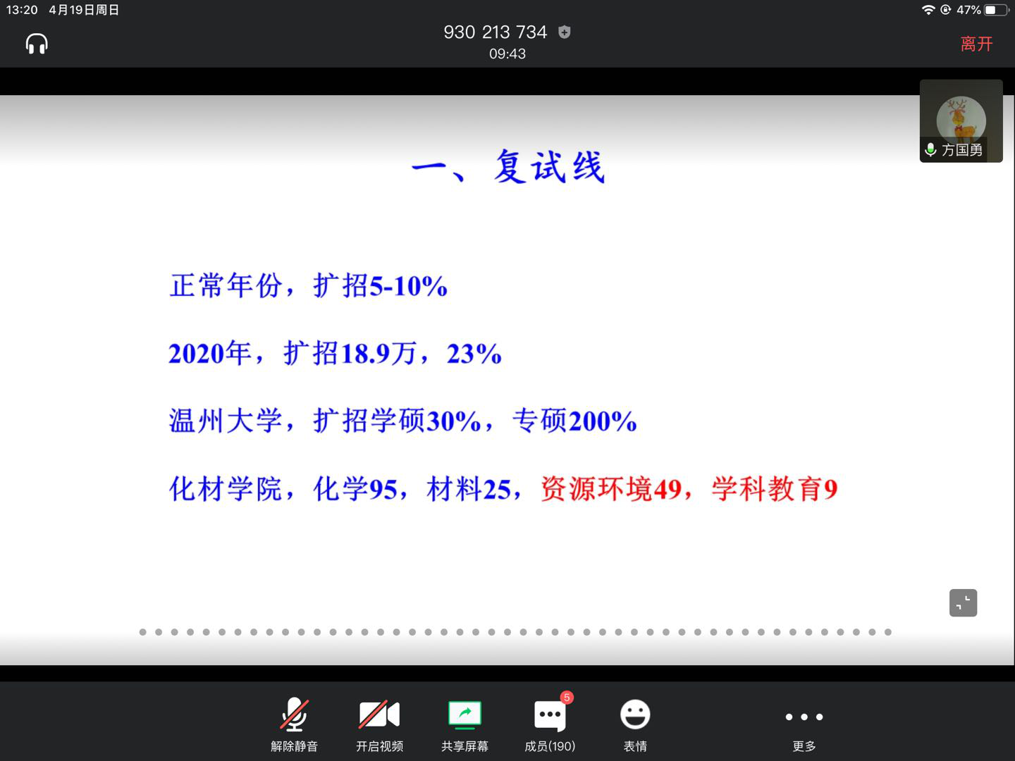 接下来,由方国勇老师向同学们介绍了现在的考研形式,较为详细地介绍了复试线、学硕、专硕的区别、适合选择的研究生专业以及不适合选择的专业、考研雷区等等考研相关的信息和往届员工踩雷得到的经验。希望同学们都可以少吃亏、高效考研。刘楠楠老师对方国勇老师的发言进行了补充和完善,提出了一些考研建议,鼓励同学们进行考研,并希望同学们在决定考研以后,可以坚持到底,不要半途而废。