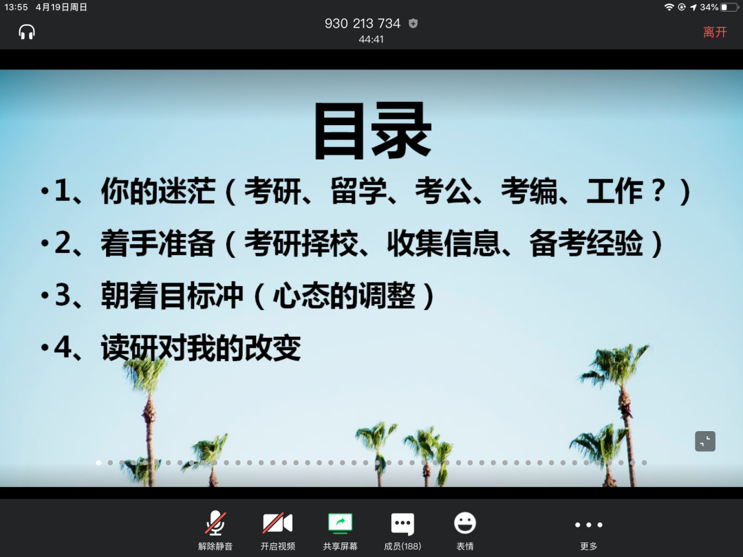 2、方国勇老师向同学们介绍了现在的考研形式,较为详细地介绍了复试线、学硕、专硕的区别、适合选择的研究生专业以及不适合选择的专业、考研雷区等等考研相关的信息和往届员工踩雷得到的经验。希望同学们都可以少吃亏、高效考研。刘楠楠老师对方国勇老师的发言进行了补充和完善,提出了一些考研建议,鼓励同学们进行考研,并希望同学们在决定考研以后,可以坚持到底,不要半途而废。