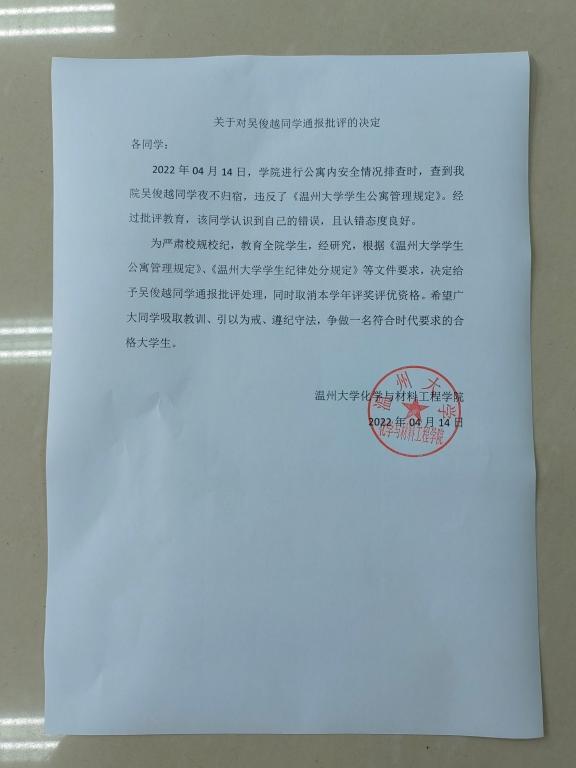 关于对吴俊越同学通报批评的决定