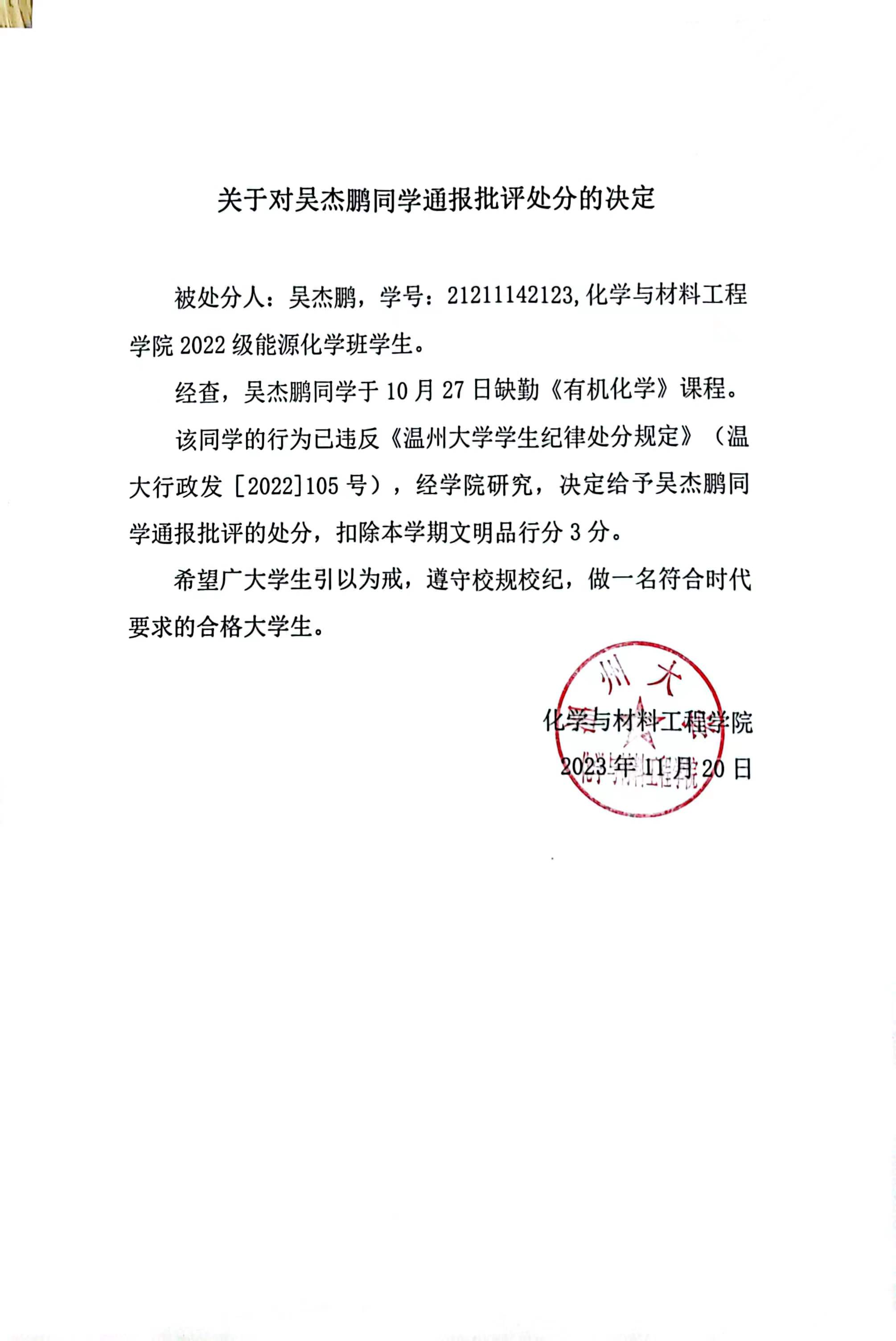 关于对吴杰鹏同学通报批评的决定