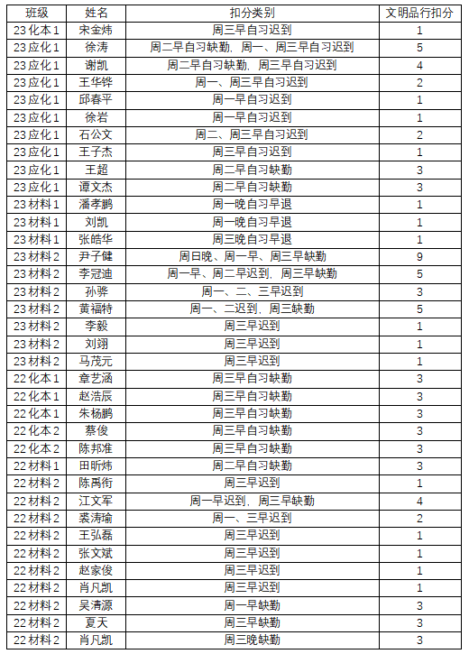 2、根据《qy球友会官网大一、大二早晚自习管理规定(201809修订)》,1次早、晚自习缺勤扣3分,学业发展部将在每周在“qy球友会体育化学与材料工程学院”微信公众号平台公布本周考勤结果,如对公布的考勤结果有异议请当周周五下午4:30前到员工科办公室11B223说明情况,过时无效。22级、23级联系邹培杰老师。3、每周将在qy球友会官网官方网站上公布上周最终考勤结果。4、早晚自习考勤结果纳入月形象班级考核。