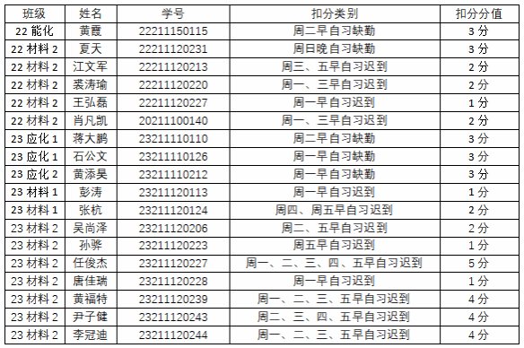 2、根据《qy球友会官网大一、大二早晚自习管理规定(201809修订)》,1次早、晚自习缺勤扣3分,学业发展部将在每周在“qy球友会官网”微信公众号平台公布本周考勤结果,如对公布的考勤结果有异议请当周周五下午4:30前到员工科办公室11B223说明情况,过时无效。22级、23级联系邹培杰老师。3、每周将在qy球友会官网官方网站上公布上周最终考勤结果。4、早晚自习考勤结果纳入月形象班级考核。