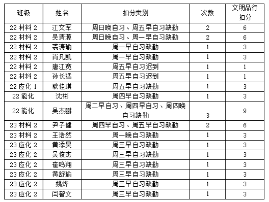2、根据《qy球友会官网大一、大二早晚自习管理规定(201809修订)》,1次早、晚自习缺勤扣3分,学业发展部将每周在“qy球友会官网”微信公众号平台公布本周考勤结果,如对公布的考勤结果有异议请当周周五下午4:30前到员工科办公室11B223说明情况,过时无效。22级、23级联系邹培杰老师。3、每周将在qy球友会官网官方网站上公布上周最终考勤结果。4、早晚自习考勤结果纳入月形象班级考核。