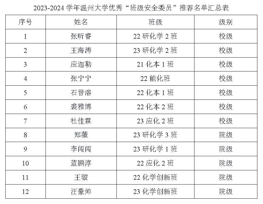 根据《qy球友会体育班级安全委员工作制度》以及《关于开展qy球友会体育2023-2024学年优秀“班级安全委员”评比活动的通知》工作要求,经班级安全委员个人申请、学院评选,推荐张昕睿等12位员工为2023-2024学年优秀“班级安全委员”拟获得者。现将名单予以公示,请各班级以及个人认真核对,如有异议请于公示期内与学工办联系。