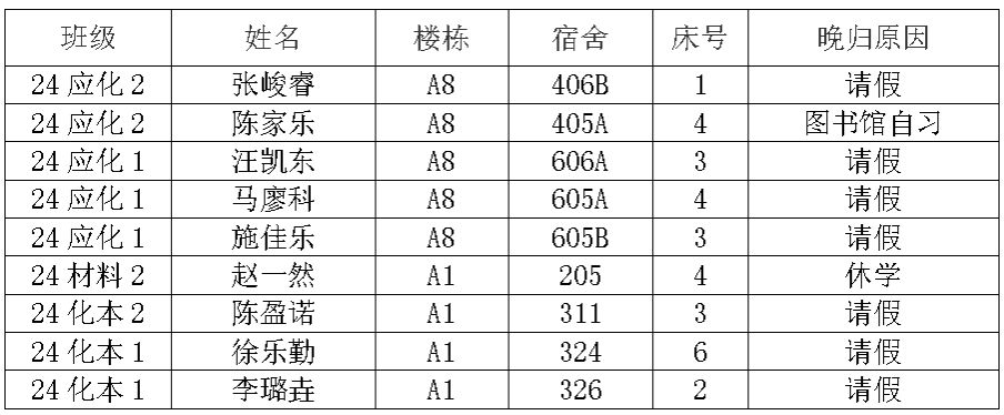 3.夜不归宿检查的同时也将对使用违规电器、饲养宠物、抽烟酗酒等违反宿舍管理规定的行为进行监督和检查;