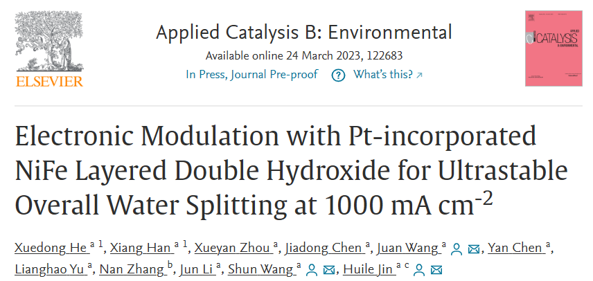 这一研究结果以“Electronic Modulation with Pt-incorporated NiFe Layered Double Hydroxide for Ultrastable Overall Water Splitting at 1000 mA cm-2”发表在国际期刊《Applied Catalysis B: Environmental》(IF=24.319),qy球友会体育为第一通讯单位,qy球友会官网科研助理何雪东为第一作者,qy球友会官网王娟副教授、金辉乐教授、王舜教授为共同通讯作者。该工作得到了国家自然科学基金项目(51872209 and 22105146)和浙江省万人科技创新领军人才计划(2019R52042)的支持。