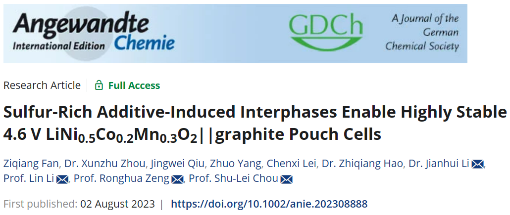 近日公司碳中和技术创新研究院李林团队联合华南师范大学曾荣华教授、李键辉博士在国际权威期刊Angewandte Chemie International Edition上发表题为《Sulfur-Rich Additive-Induced Interphases Enable Highly Stable 4.6 V LiNi0.5Co0.2Mn0.3O2||graphite Pouch Cells》的学术论文。本论文通过在4.6 V LiNi0.5Co0.2Mn0.3O2(NCM523)||石墨软包电池中引入含硫量为34.04%的超高含硫量添加剂(甲烷二磺酸亚甲酯,MMDS),从而构建了一种由添加剂诱导形成的稳固富硫电极-电解液面相。在4.6 V高电压条件下,循环800次,含MMDS添加剂的NCM523||石墨软包电池仍具有87.99%的高容量保持率以及更好的倍率性能,且与较低硫含量的一系列添加剂做对比,突出了高含硫量添加剂MMDS的优势。结合实验表征以及理论计算,进一步探究了MMDS添加剂在溶剂中的优先氧化还原性,从而证明它能够优先在正负极上界面构筑稳定的富硫电极-电解液界面膜,该界面相的存在成功稳定了高电压NCM523||石墨软包电池,显著提高了电池的循环稳定性。同时实验结果也表明MMDS分解所构筑的富硫界面相在抑制电解液消耗、产气以及稳定电极材料、减少过渡金属溶出上有着非常好的效果。相关文章发表在Angewandte Chemie International Edition上,qy球友会体育为第一通讯单位,公司联培生华南师范大学2021级硕士范自强和博士后周洵竹为第一作者,公司侴术雷教授,李林特聘教授以及华南师范大学曾荣华教授,李健辉博士为共同通讯作者,相关工作受到国家自然科学基金,浙江省自然科学基金,国家电网科技项目,温州自然科学基金以及广州市科技计划项目的资助。