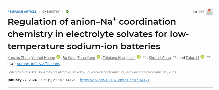 近日公司碳中和技术创新研究院李林团队联合南开大学李福军教授在国际权威期刊Proceedings of the National Academy of Sciences of the United States of America上发表题为“Regulation of Anion-Na+ Coordination Chemistry in Electrolyte Solvates for Low Temperature Sodium-Ion Batteries”的学术论文。文中选用高电子亲和能力的阴离子三氟乙酸根(TFA-)调控1.0 M NaPF6-G2电解液中的溶剂化学。该全氟阴离子的DN值高达34.0 kcal mol-1,其强配位作用使其全部参与内溶剂化鞘层,实现常规浓度下更多阴离子占据的溶剂化构型。与1.0 M NaPF6-G2电解液相比,增强的TFA-和降低的G2配位的溶剂化化学加速了界面Na+去溶剂化行为,呈现出较低的去溶剂化能(40至-20 ℃:3.49 vs. 4.16 kJ mol-1;-20至-60 ℃:16.55 vs. 24.74 kJ mol-1)。可诱导均匀稳定的Na沉积,实现25 ℃下500圈99.9%的超高超稳定的库仑效率。同时,Na||Na3V2(PO4)3电池在-40 ℃下循环呈现出60.2%的室温容量和100圈后99.2%的高容量保持率。这项工作为溶剂化化学调控助力高性能低温钠离子电池发展提供了新的见解。公司博士后周洵竹为第一作者,公司侴术雷教授,李林特聘教授以及南开大学李福军教授为共同通讯作者,相关工作受到国家自然科学基金,中国博士后科学基金及海河可持续化学转化实验室的资助。